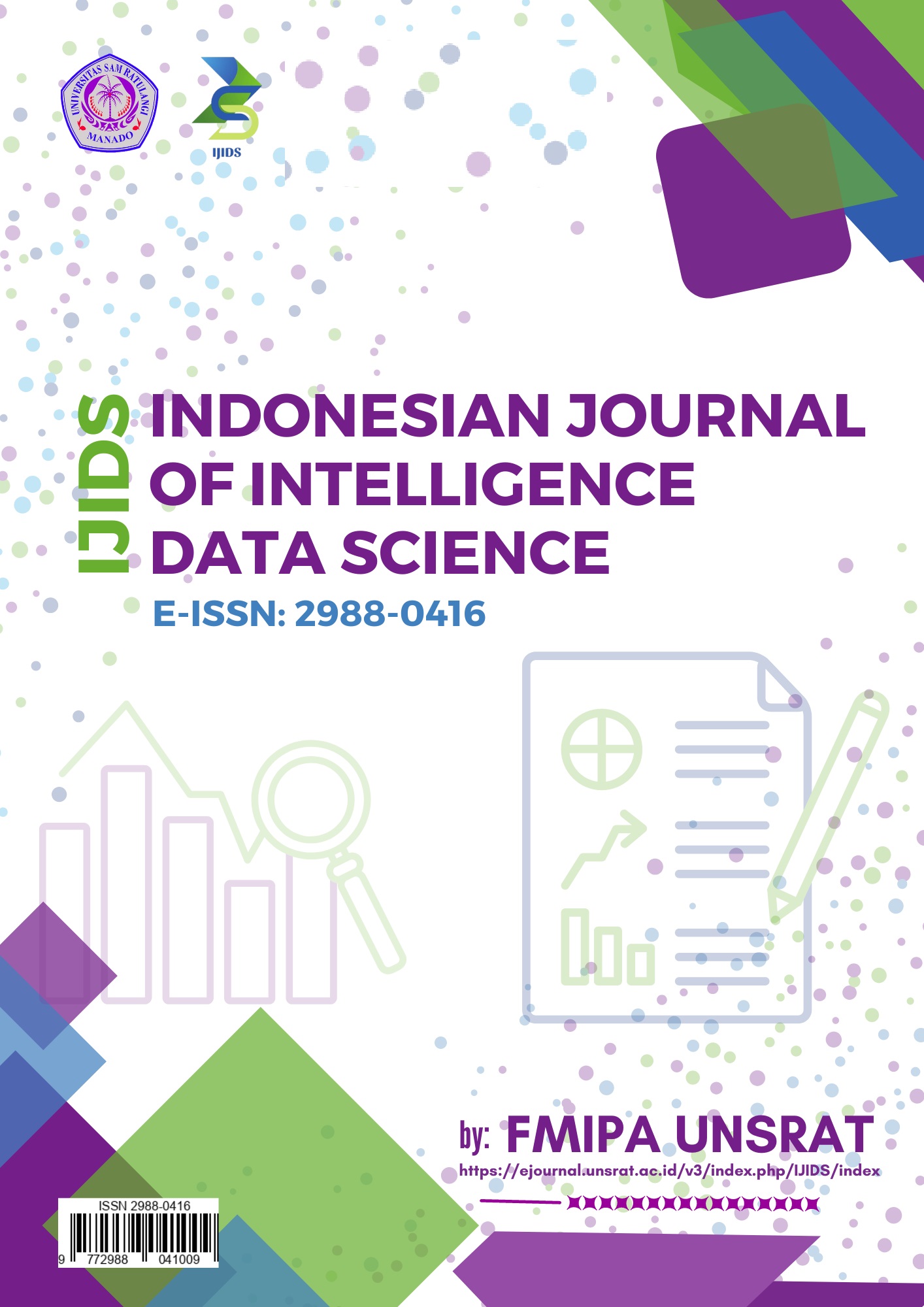 Vol. 3 No. 1 (2024)IJIDS Volume 3, No. 1 of 2024 features seven Indonesian-language articles across 72 pages. Topics include mangrove ecosystem mapping with remote sensing, a decision support system for school recommendations using SAW, consumer price index forecasting in Palu with ARIMA, flood-prone area mapping with GIS, flood evacuation route optimization in Manado using Dijkstra’s algorithm, a web-based academic service system at FMIPA UNSRAT, and a web-based pharmacy information system with PXP and MVC architecture.