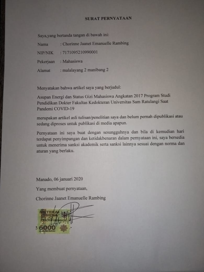 Abstract: The COVID-19 pandemic has caused major health problems as well as social and economic instability. Mitigation measures, such as quarantine, work from home, study from home, can affect the food supply chain and cause food and nutrition insecurity in various regions of the world. The research objective was to determine the relationship between energy intake and nutritional status of students at the Faculty of Medicine, University of Sam Ratulangi Manado during the COVID-19 pandemic. An observational analytic study was conducted with a cross-sectional approach which was conducted from September - December 2020 to 105 students who met the sample criteria. Energy intake data were obtained from a 2x24 hour food recall questionnaire with the google spreadsheet application and the survey survey. Nutritional status data based on BMI were obtained via e-questionare with the google form application. Correlation analysis was performed using the Spearman rank test in the SPSS program. The total energy intake of the respondents was 1583.07 ± 408.024 kcal. As many as 8 people had underweight nutritional status, 46 people had normal nutritional status, 20 people had At risk nutritional status, 26 people with obese 1 nutritional status and 5 people with obese 2 nutritional status as many as 5 people. There was no significant relationship (p ≥ 0.05) between energy intake and nutritional status.