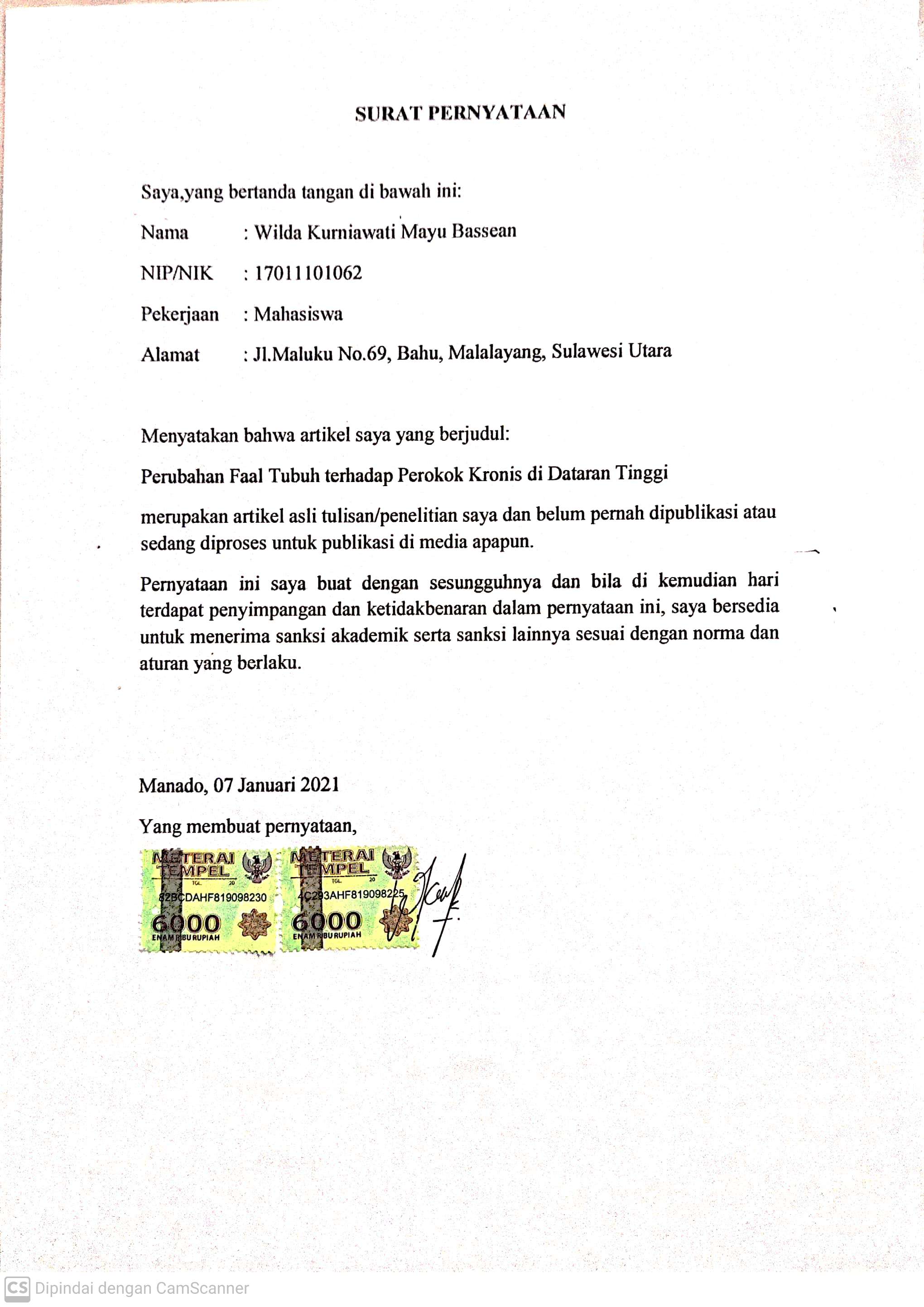 Abstrak: Rokok memiliki dampak buruk bagi kesehatan manusia. Akumulasi kandungan asap rokok dalam tubuh ternyata dapat memberikan banyak perubahan fisiologi pada tubuh manusia. Keadaan tersebut akan semakin parah apabila ditambah dengan kondisi tempat tinggal khususnya di dataran tinggi yang dapat menimbulkan risiko terkena penyakit kronis meskipun seseorang telah mengalami aklimatisasi. Penelitian ini bertujuan untuk mengetahui perubahan faal tubuh terhadap perokok kronis di dataran tinggi. Penelitian ini merupakan penelitan yang sifatnya literature review. Penelitian ini juga mempelajari topik-topik terkait perubahan fisiologis terhadap perokok kronis di dataran tinggi dari penelitian-penelitian sebelumnya. Literatur yang diulas dan dipelajari dalam penelitian ini sebanyak 10 literatur yang terdiri dari 6 cross-sectional study, 3 cohort study, dan 1 repeated measures design. Hasil penelitian literature review menunjukkan bahwa perokok kronis yang berada di dataran tinggi ataupun pendaki yang memiliki riwayat merokok aktif dapat mengalami beberapa perubahaan fisiologis pada tubuhnya. Merokok di dataran tinggi dapat meningkatkan heart rate (HR) dan tekanan darah. Kadar saturasi oksigen (SpO2) menurun dan kadarnya lebih rendah dibanding bukan perokok di tinggi ataupun perokok di dataran rendah. Nilai VO2 max menurun. Konsentrasi hemoglobin (Hb) perokok di dataran tinggi meningkat akibat menurunnya kadar saturasi oksigen. Perokok di dataran tinggi memiliki hubungan yang signifikan terkait risiko terkena penyakit Acute Mountain Sickness (AMS). Proteinuria juga ditemukan pada 80% pendaki yang memiliki riwayat merokok dan terkena penyakit AMS.Â