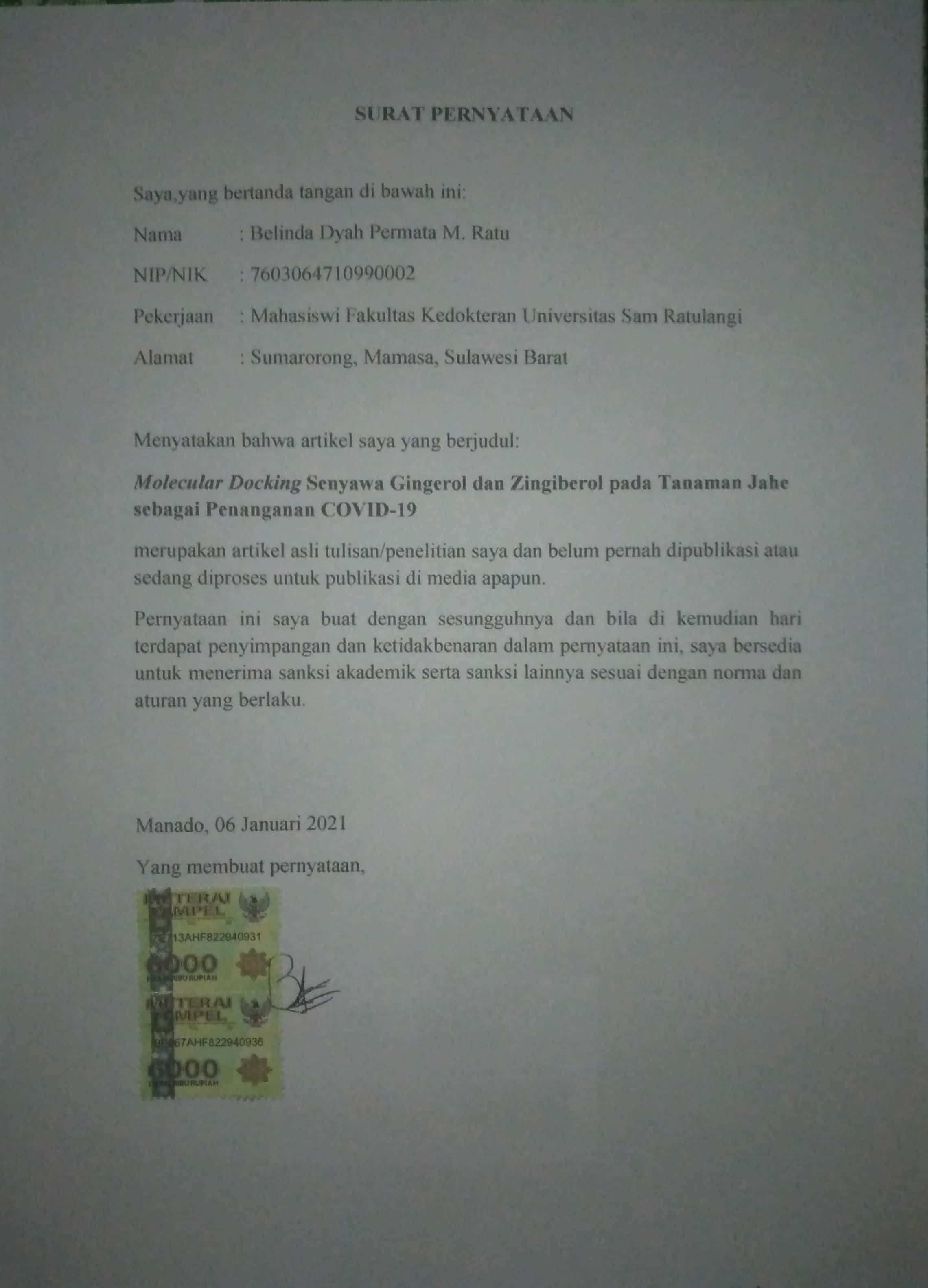 Abstrak: COVID-19 merupakan sebuah penyakit yang baru. Banyak masyarakat yang merasakan dampak dari penyakit ini. Belum ada pengobatan pasti untuk menyembuhkan COVID-19, sehingga banyak masyarakat yang menggunakan pengobatan tradisional untuk menangkal COVID-19, termasuk jahe. Penelitian ini bertujuan untuk mengetahui apakah ada interaksi antara senyawa pada jahe (gingerol dan zingiberol) dengan main protease COVID-19 (6LU7). Penelitian ini menggunakan metode molecular docking dengan menggunakan 4 aplikasi utama, yaitu Autodock Tools, Autodock Vina, Biovia Discovery Studio 2020, dan Open Babel GUI. Sampel yang digunakan yaitu senyawa gingerol dan zingiberol pada tanaman jahe yang diunduh di Pubchem. Data yang digunakan dalam penelitian ini menggunakan database Mendeley, Clinical Key, dan PubMed. Penelitian menunjukkan bahwa hampir semua residu asam amino pada senyawa gingerol bekerja pada sisi aktif 6LU7, sedangkan tidak demikian pada zingiberol. Hasil binding affinity senyawa jahe, baik gingerol maupun zingiberol tidak melebihi binding affinity remdesivir, obat yang banyak diteliti sebagai obat penanganan COVID-19. Sebagai simpulan, senyawa gingerol dan zingiberol pada tanaman jahe tidak dapat dipertimbangkan sebagai penanganan COVID-19