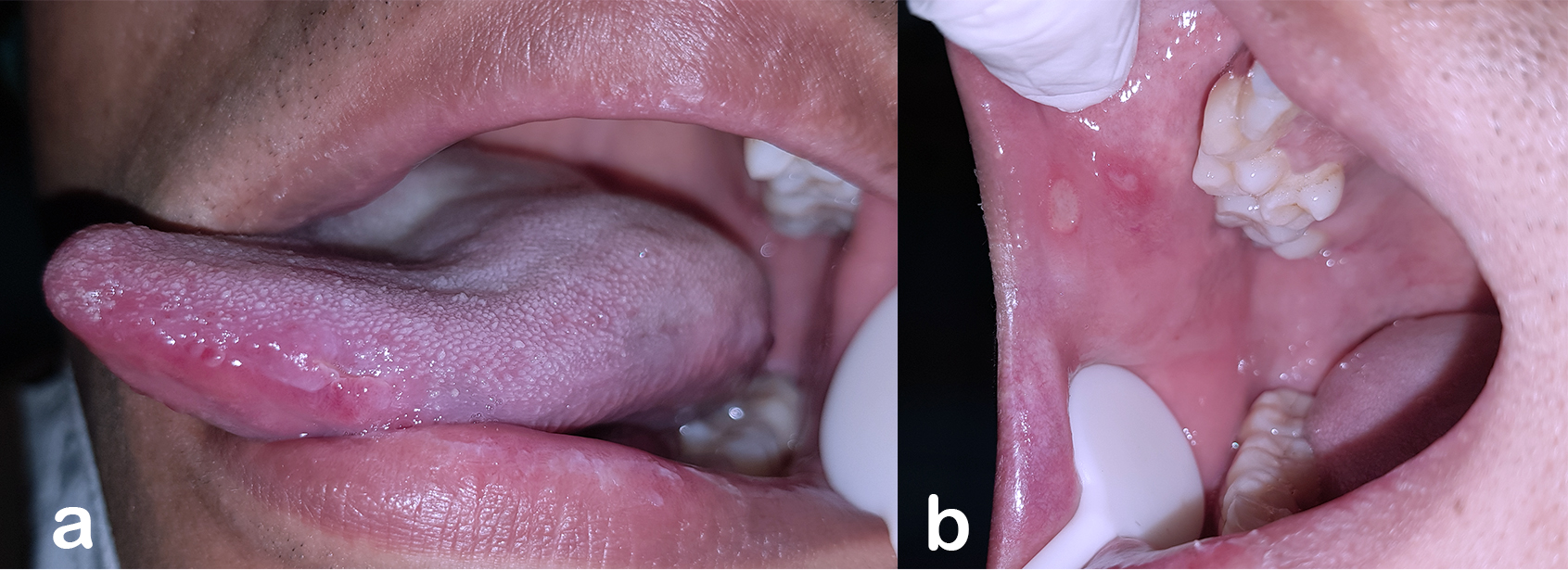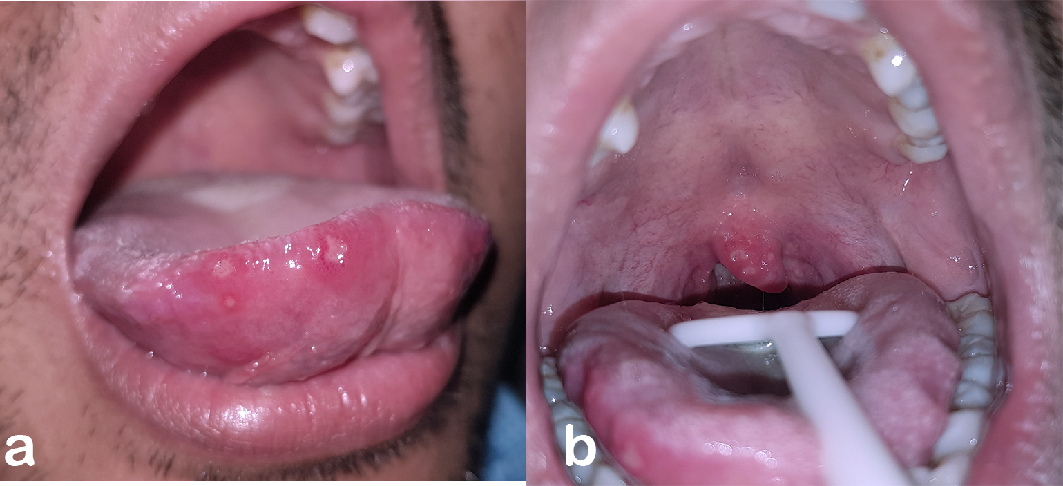 - Figure 1. Multiple ulcers on the tongue (a) and pharynx (b) at the first visit.