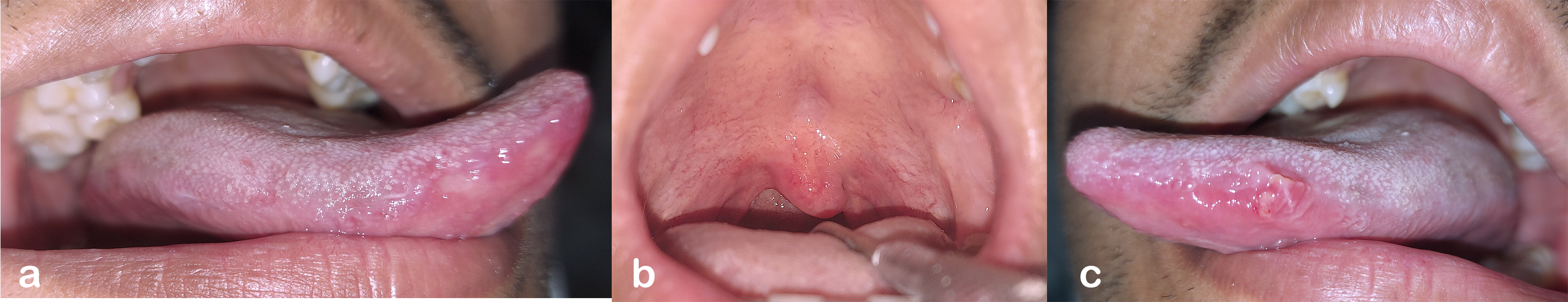 - Figure 2. Second visit. Healing of the right lateral tongue (a) and pharynx (b) at the second visit. New ulcer on the left lateral tongue (c)