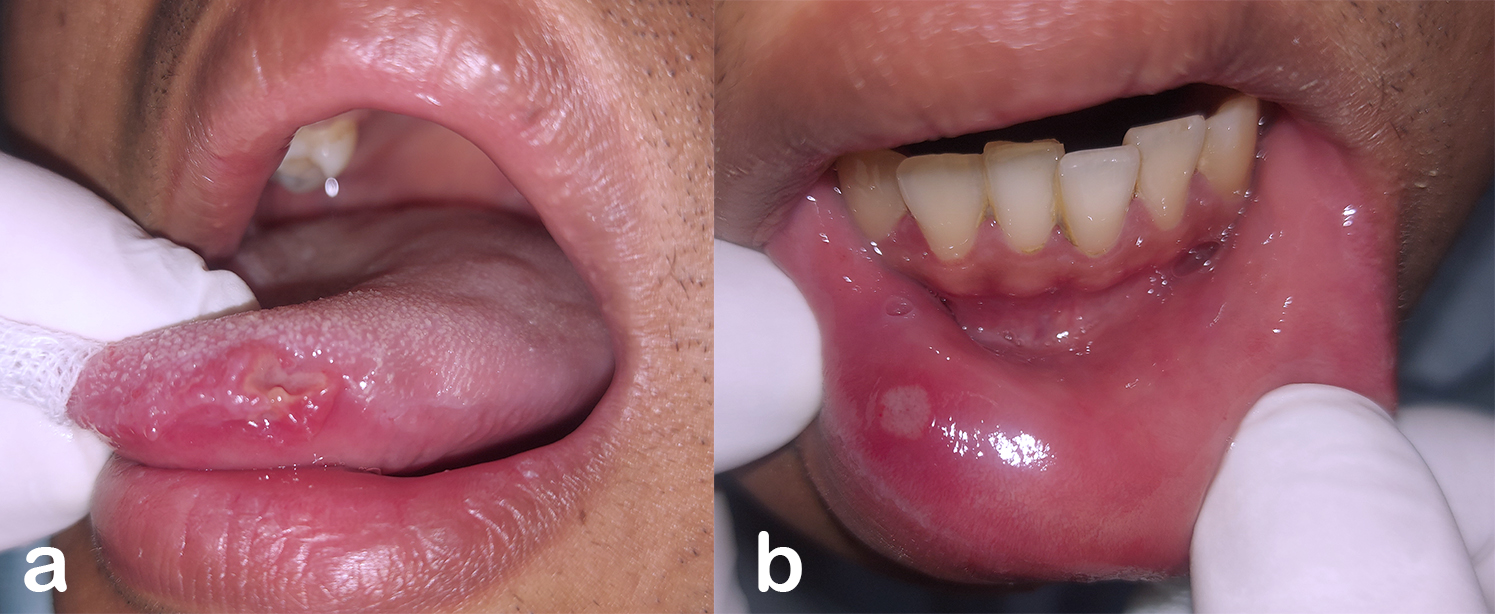 - Figure 3. Third visit. Ulcer on the left lateral tongue (a) has not yet healed, and a new ulcer appears on the lower lip mucosa (b).