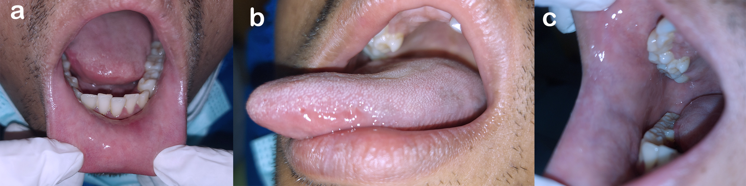 - Figure 5. After using valacyclovir, there were no lesions on the lower labial mucosa (a), left lateral tongue (b), and right buccal mucosa (c) at the fifth visit.