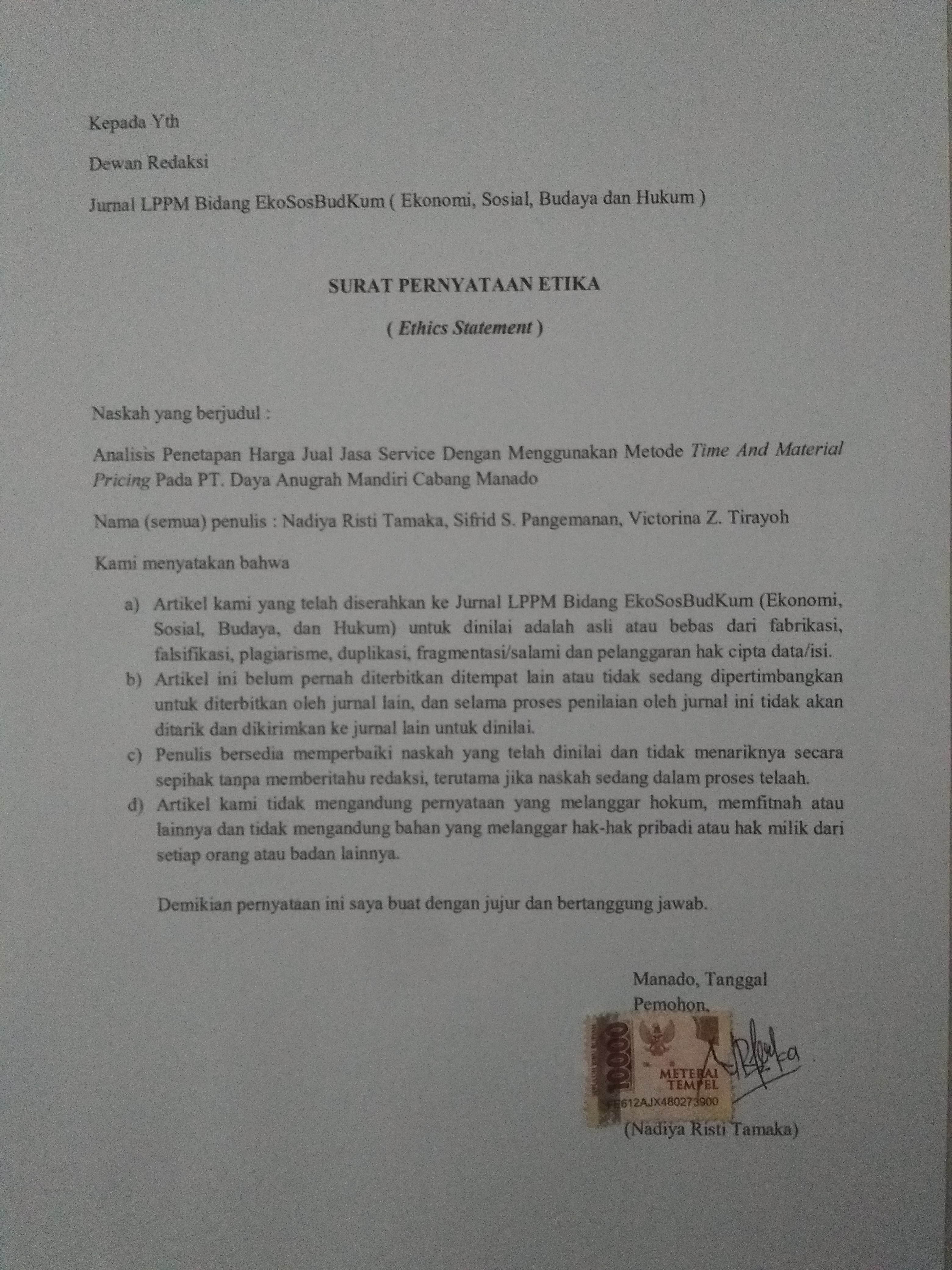 ANALISIS PENETAPAN HARGA JUAL JASA SERVICE DENGAN MENGGUNAKAN METODE TIME AND MATERIAL PRICING PADA PT. DAYA ANUGRAH MANDIRI CABANG MANADO