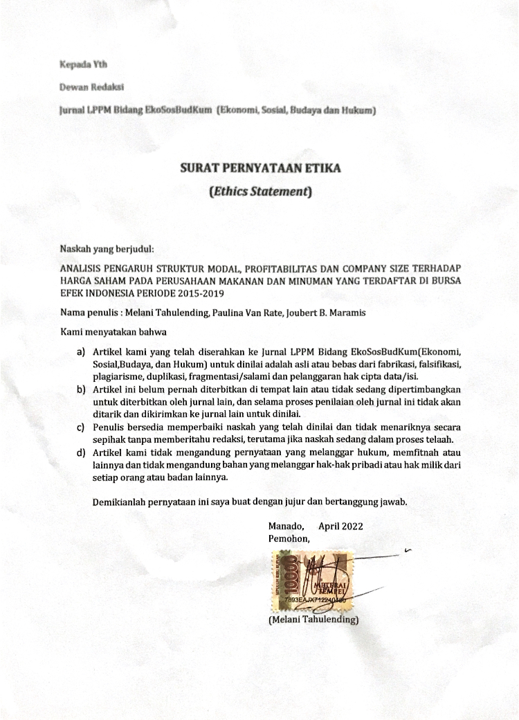 - ANALISIS PENGARUH STRUKTUR MODAL, PROFITABILITAS DAN COMPANY SIZE TERHADAP HARGA SAHAM PADA PERUSAHAAN MAKANAN DAN MINUMAN YANG TERDAFTAR DI BEI PERIODE 2015-2019