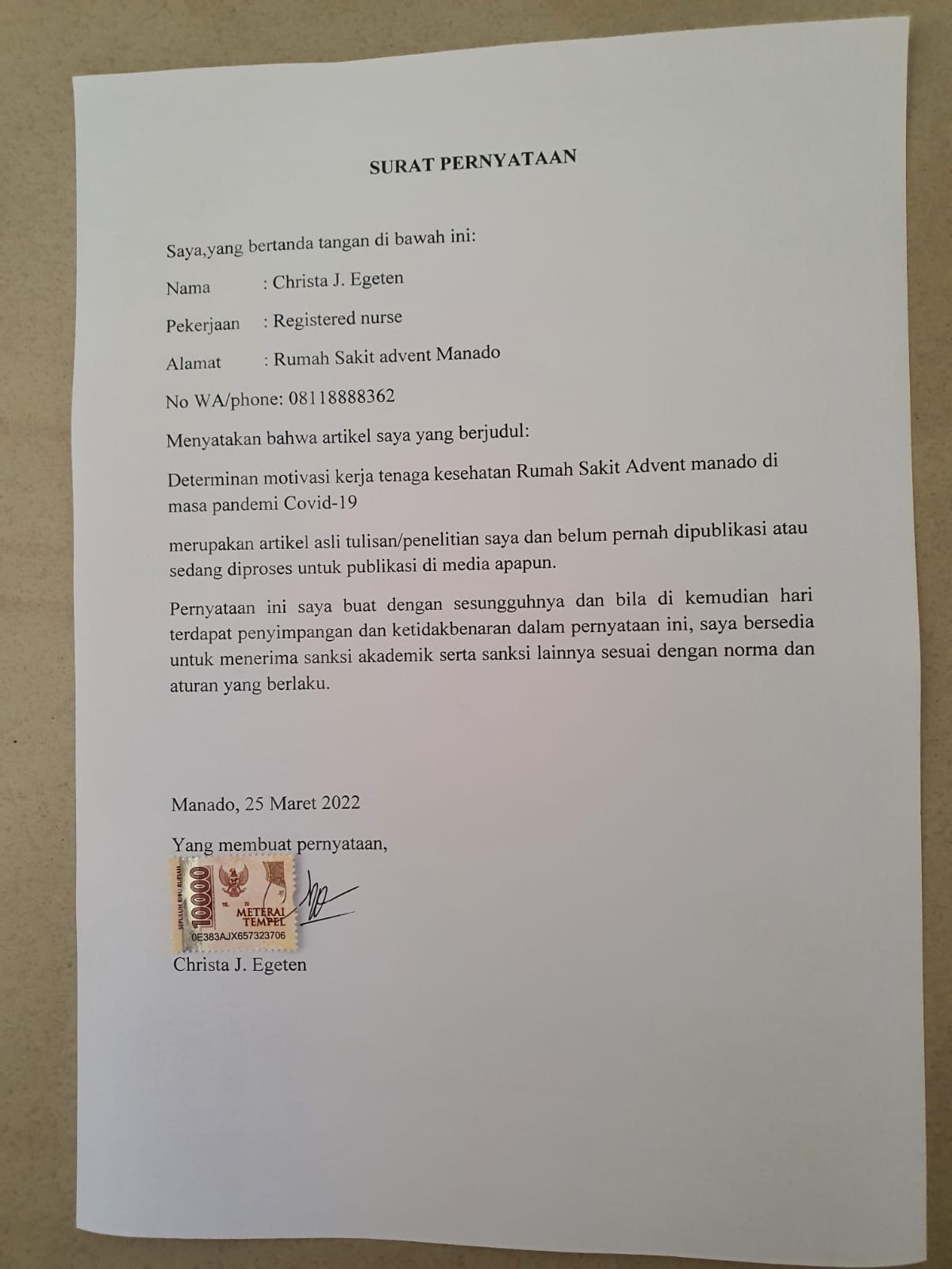Determinants of Work Motivation for Manado Adventist Hospital Health Workers during the Covid-19 Pandemic